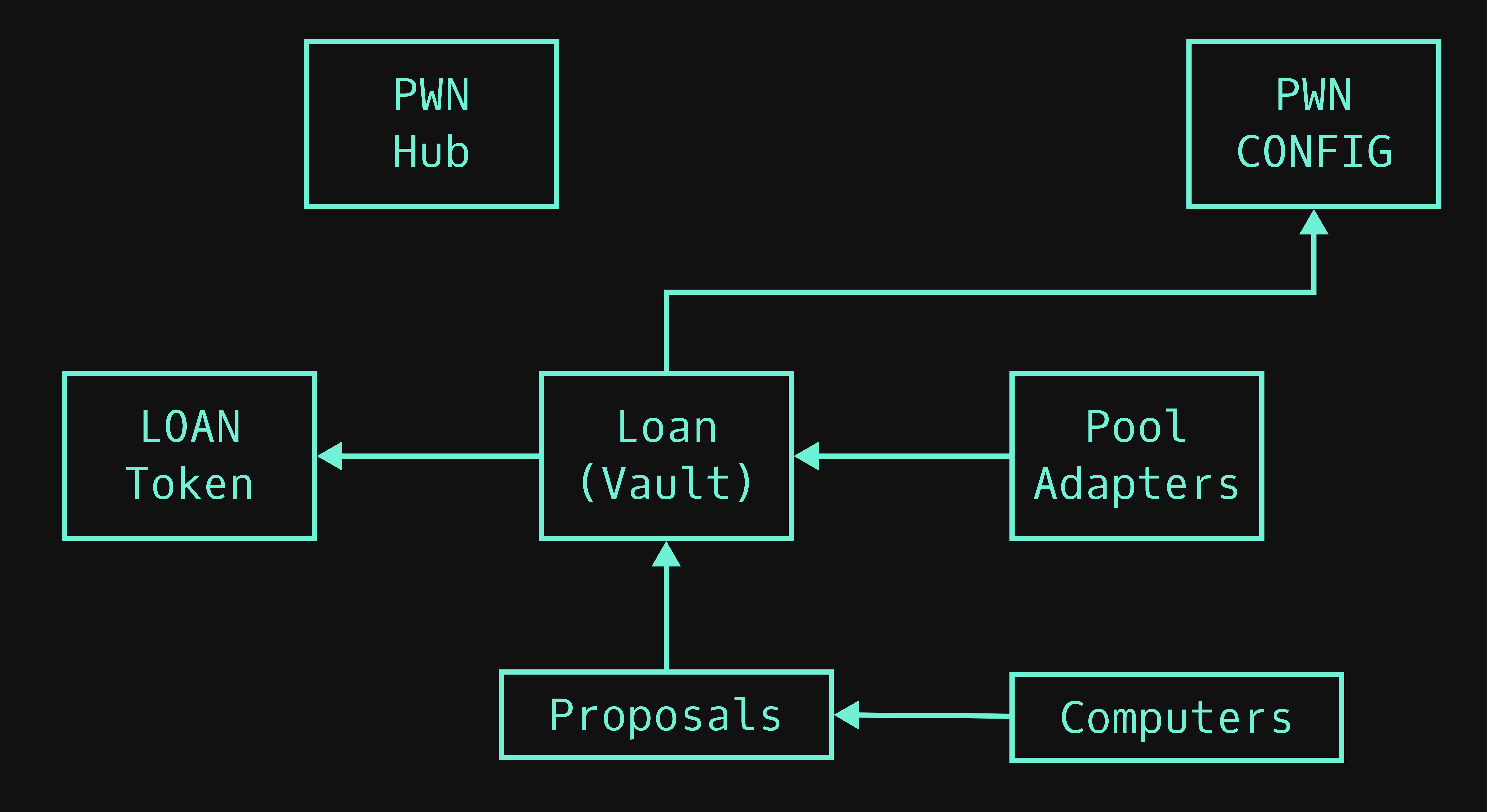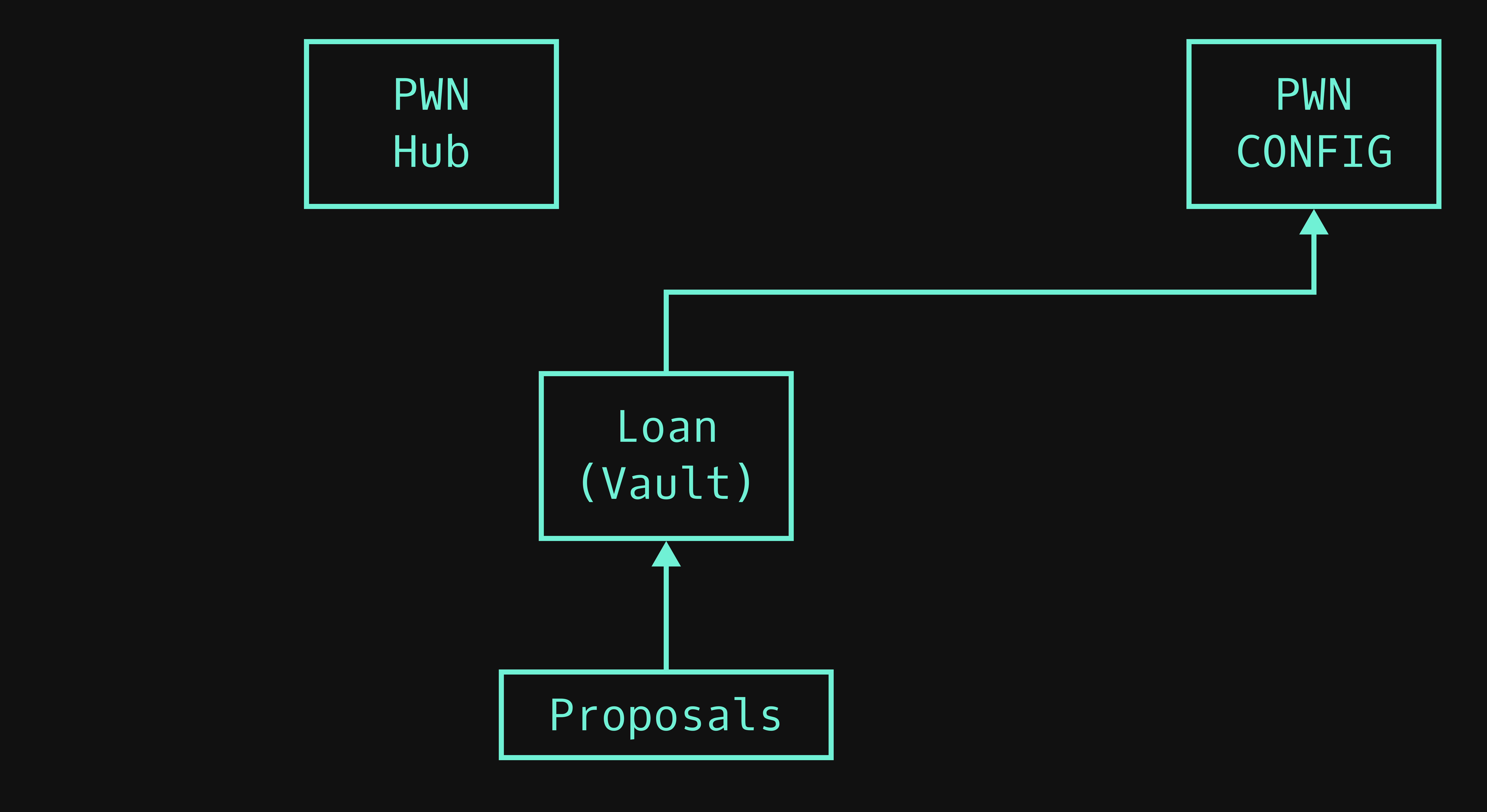 The Loan contracts are the primary contracts doing business logic. Given a proposal (we will talk about them in more detail later), the contract creates a loan. There can be an unlimited number of these contracts, we call them loan types. The Loan contracts can implement any logic, for example, simple loans or perpetual loans. Each loan type has to be added to the PWN Hub by the PWNDAO.